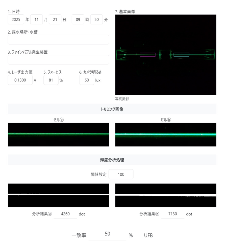 - 「セルA」の輝度は、気泡や液中の汚染等のウルトラファインバブル以外の粒⼦によっても影響を受けます。それによって「セルB」との⽐較判定ができにくい場合があります